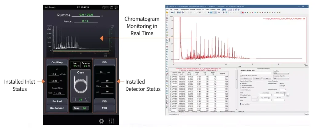Pantalla LCD táctil intuitiva (10,1”) que permite monitorear módulos equipados (entradas, detectores, horno) de un vistazo, junto con los cromatogramas y la programación de temperatura en tiempo real.