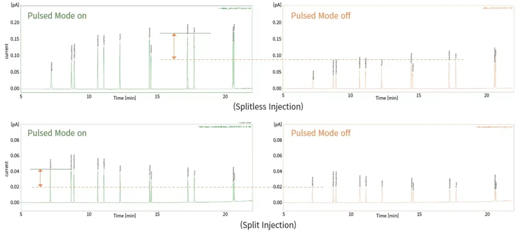 • Modo de presión pulsada (Split/Splitless): Aumento instantáneo de la presión en la inyección que minimiza la dispersión de la muestra, proporcionando una sensibilidad significativa
